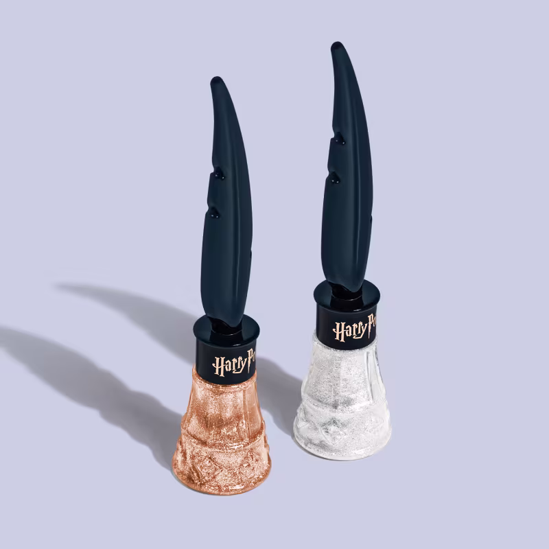 Aqui o design roubou a cena. Os delineadores possuem uma embalagem que remete a um tinteiro clássico de Hogwarts. O pincel é finíssimo, garantindo traços precisos. Estão disponíveis nas cores: