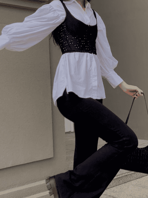 Quer um look digno de street style? Pegue uma camisa bem larga e vista um top cropped, corset ou corpete por cima dela. Isso marca a cintura, cria uma silhueta totalmente nova e tira a camisa social do seu lugar comum corporativo.